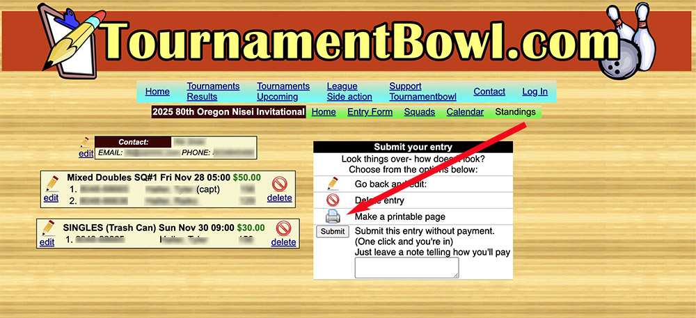 Verify your entries. Then, click the “printer” icon to get a copy of your entries and a total “Balance Due”. If paying by card online, save an electronic file and attach it to the PayPal payment form. If paying by check, print a hard copy and include it with your check. Enter “card” “check” or “cash” and the name of the person responsible for payment in the comment box. NOTE: Entries will not be accepted until payment is RECEIVED.